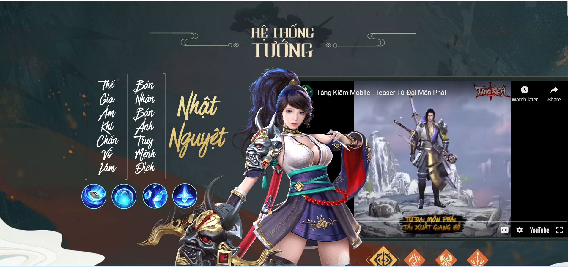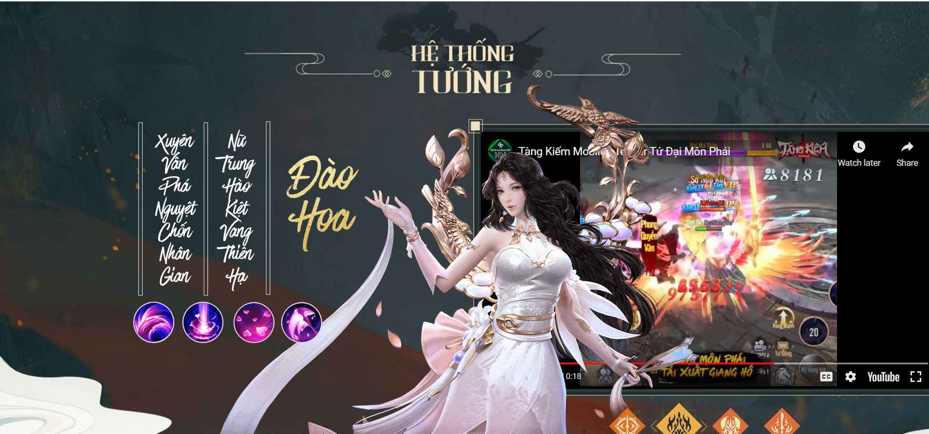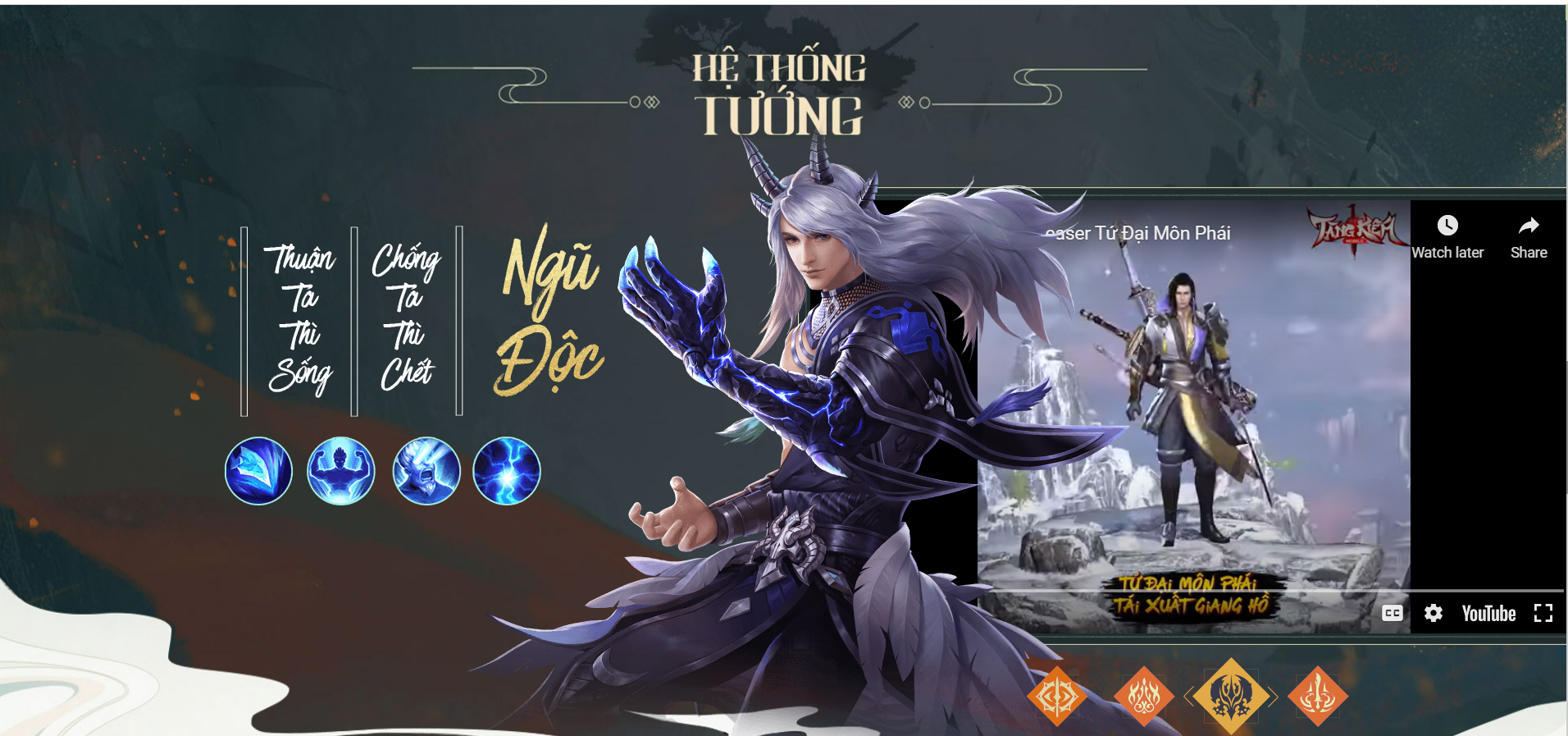 Bước chân vào game, bạn vẫn sẽ được chọn các class võ hiệp trong game sở hữu trong những vũ khí đặc trưng cho từng môn phái khác nhau, bao gồm: Võ Đang, Nga My, Ngũ Độc và Bách Hoa. Mỗi nhân vật sẽ có đặc điểm và ngoại hình khác nhau, đảm bảo trải nghiệm mỗi lần chơi của bạn đều khác.