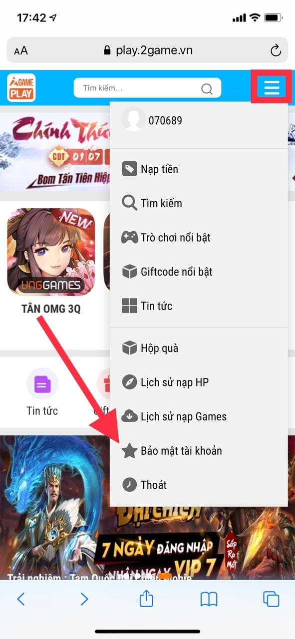 Sau khi đăng nhập, click vào tên tài khoản ở giao diện thông tin tài khoản, các bạn hãy chọn vào BẢO MẬT TÀI KHOẢN