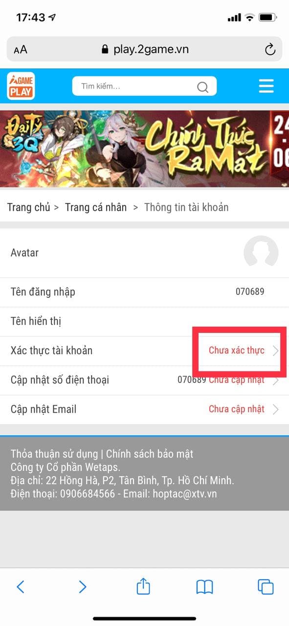 - Khi nhấp chuột vào “chưa xác thực” ở mục Xác thực tài khoản xuất hiện thông tin: