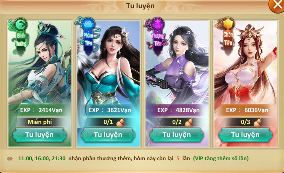 -22h00- 22h30 - Có 4 hình thức tu luyện với mức tiêu tốn vật phẩm tu luyện và lượng exp nhận được khác nhau: