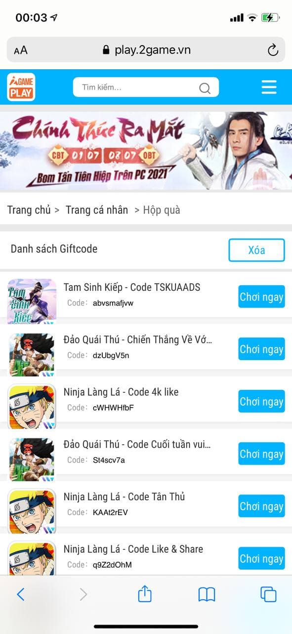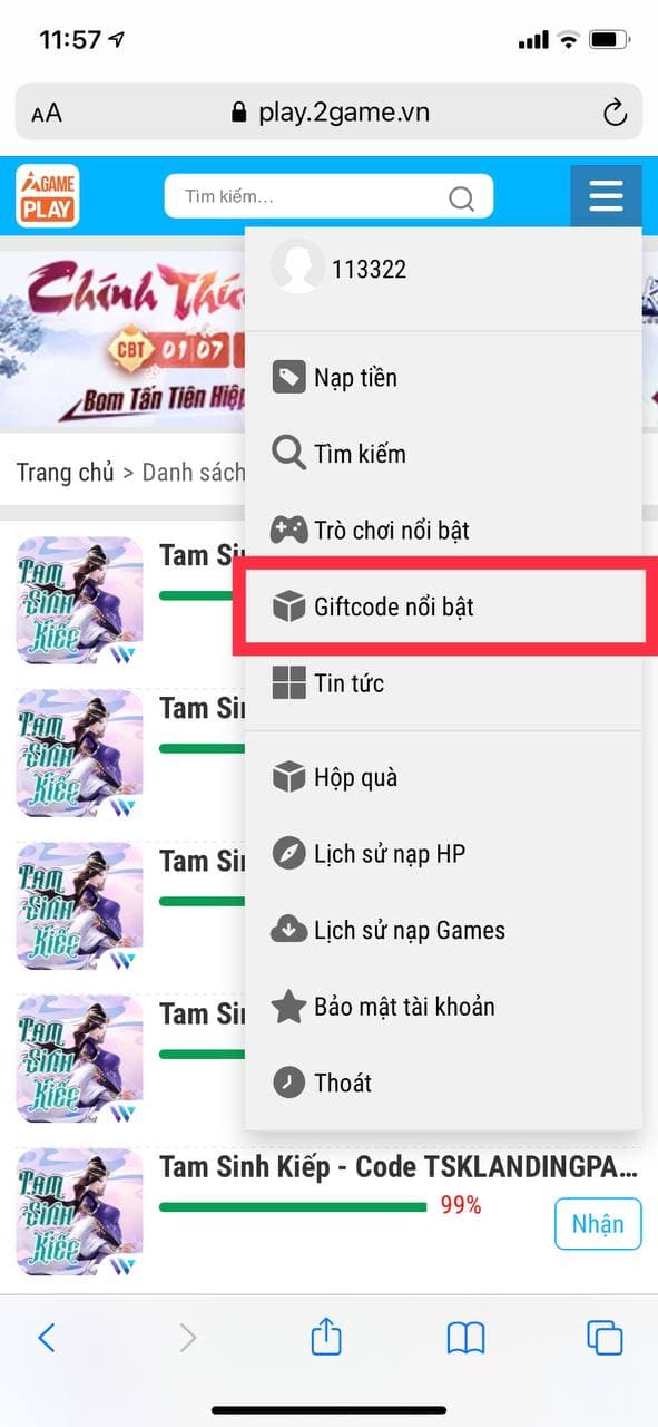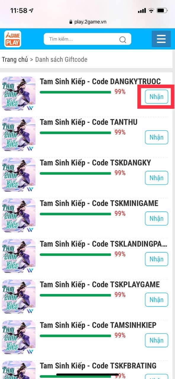 Bước 2: Chọn “TAM SINH KIẾP” để nhận code cho game. Chọn code mà bạn muốn nhận -> Nhận mã - > Copy.