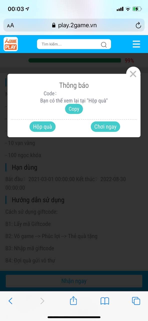 Bước 1: Truy cập https://play.2game.vn/gift/ để có thể nhận được các giftcode từ cổng game. (Các Tộc Trưởng phải đăng nhập tài khoản thì mới có thể nhận được)