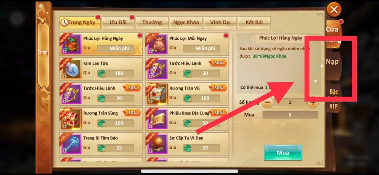 Sau khi chọn mục NẠP, các gói Nạp sẽ hiển thị: