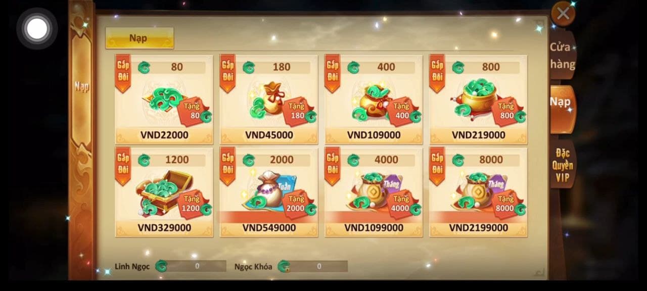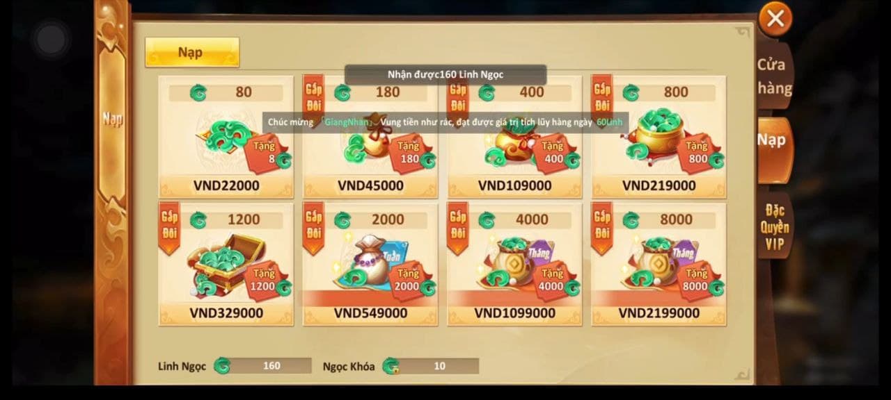 - Các gói nạp lần đầu tiên đều có " Khuyến mãi x2 LINH NGỌC ". VD: 22.000vnd <=> 80LN x2 = 160LN.